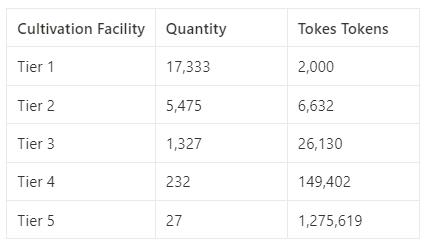 The table below shows the exchange rate between Tokes tokens(TKS) and the different tiers of Cultivation Facilities: