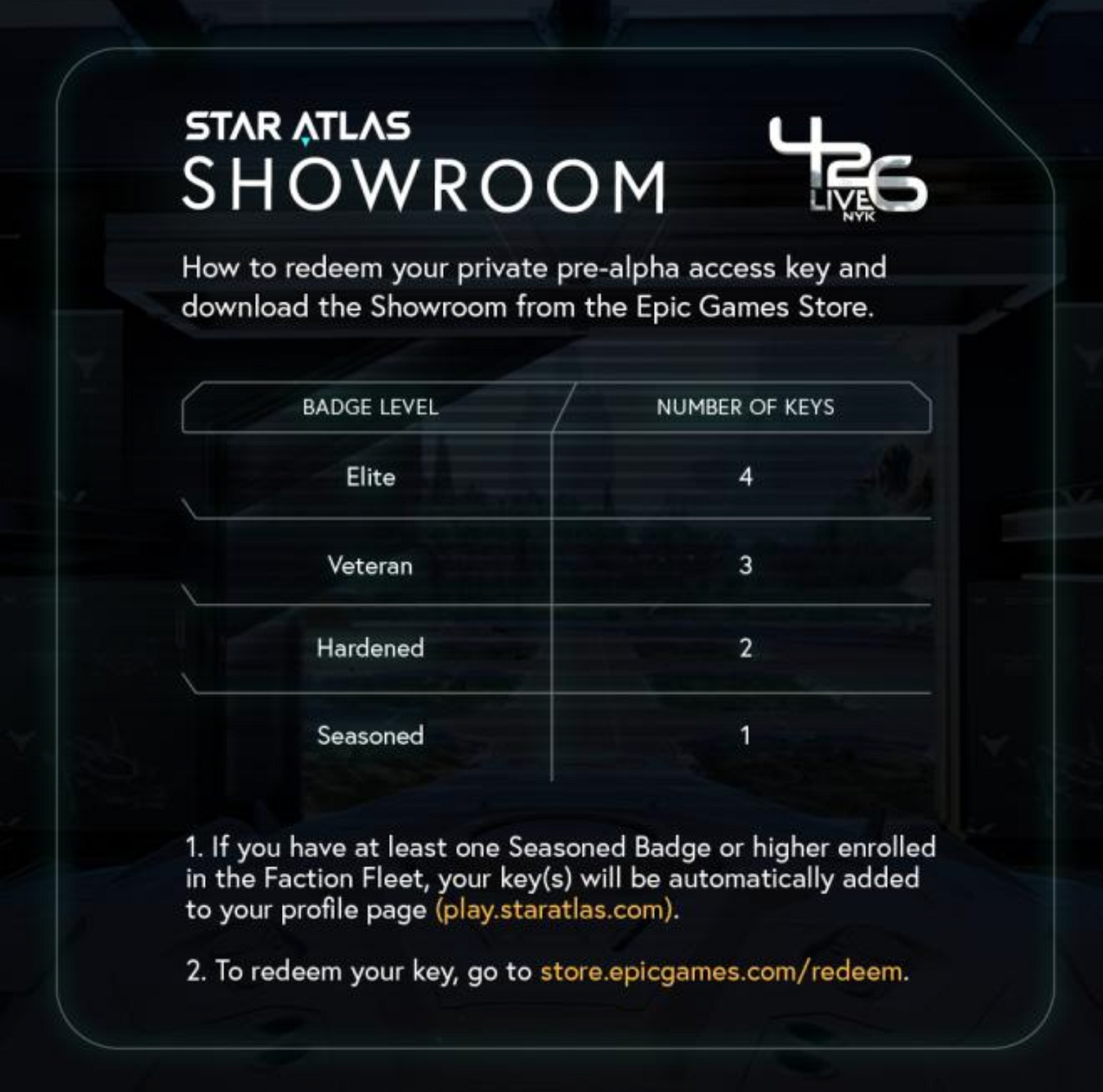 On September 29, 2022, players who have at least one Seasoned Badge or higher enrolled in the Faction Fleet gain instant access to the Showroom. Players with higher tiered badges will be given additional game keys which can be given away to other players.
