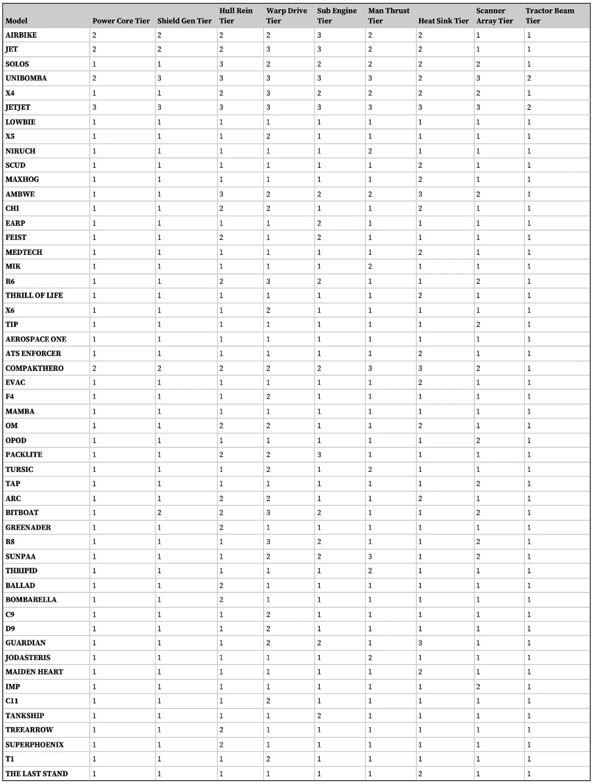 - Tier 0 core components — The fundamental components necessary for a ship to function: power core, shield generators, hull reinforcement, warp drive, sub-engine, main thrusters, heat sinks, scanner array, and tractor beams.
