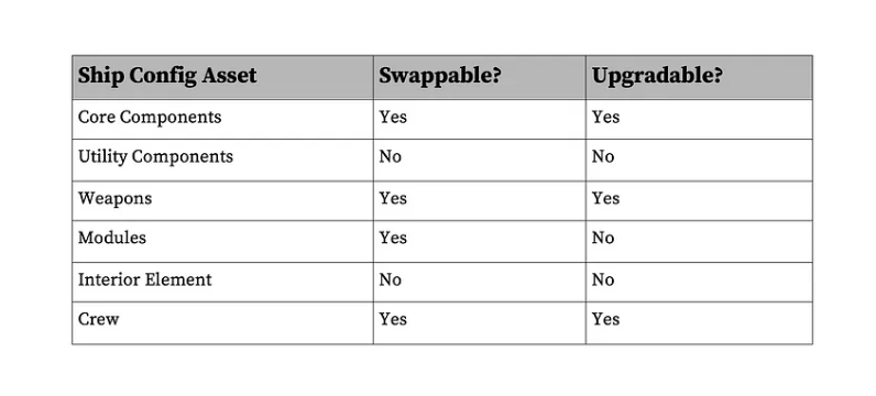 In this new paradigm, six different assets impact the ship functions and overall performance, some of which are swappable or upgradeable. To make it easy for our captains, we have broken down how they will work in the picture below: