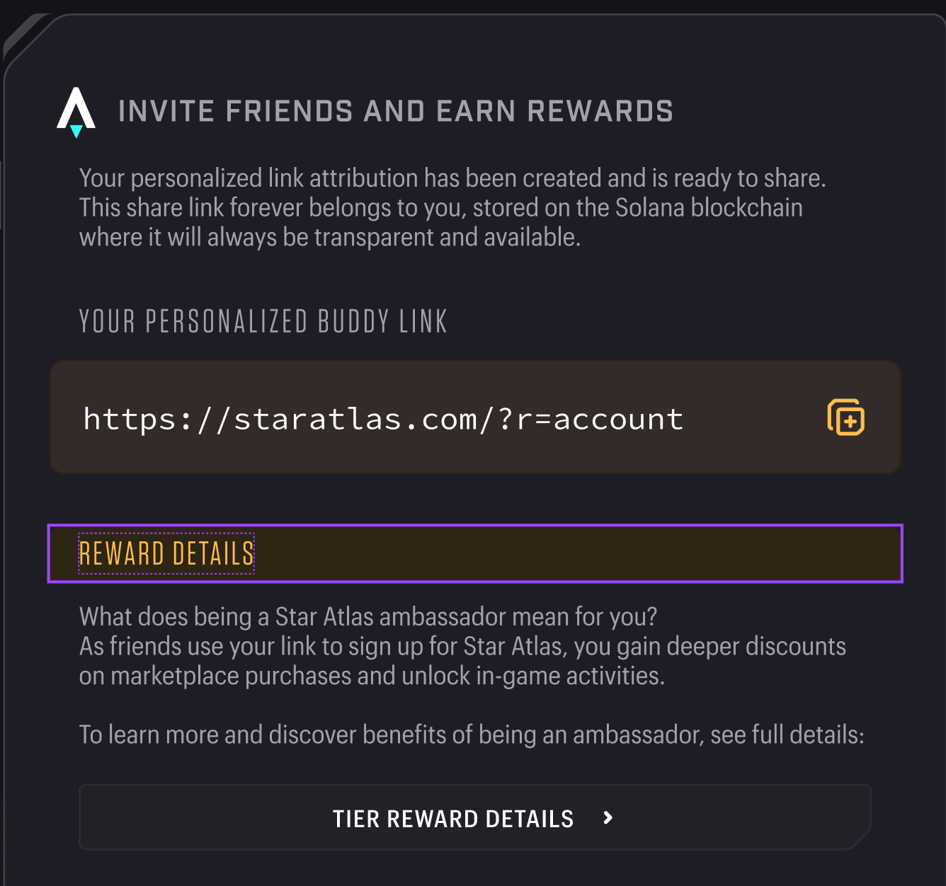 Users sign up for Starpath at Play.StarAtlas.com, where a referral link is generated in their Player Profile. A link in their profile also leads to the Buddy Link platform for monitoring referral activity.
