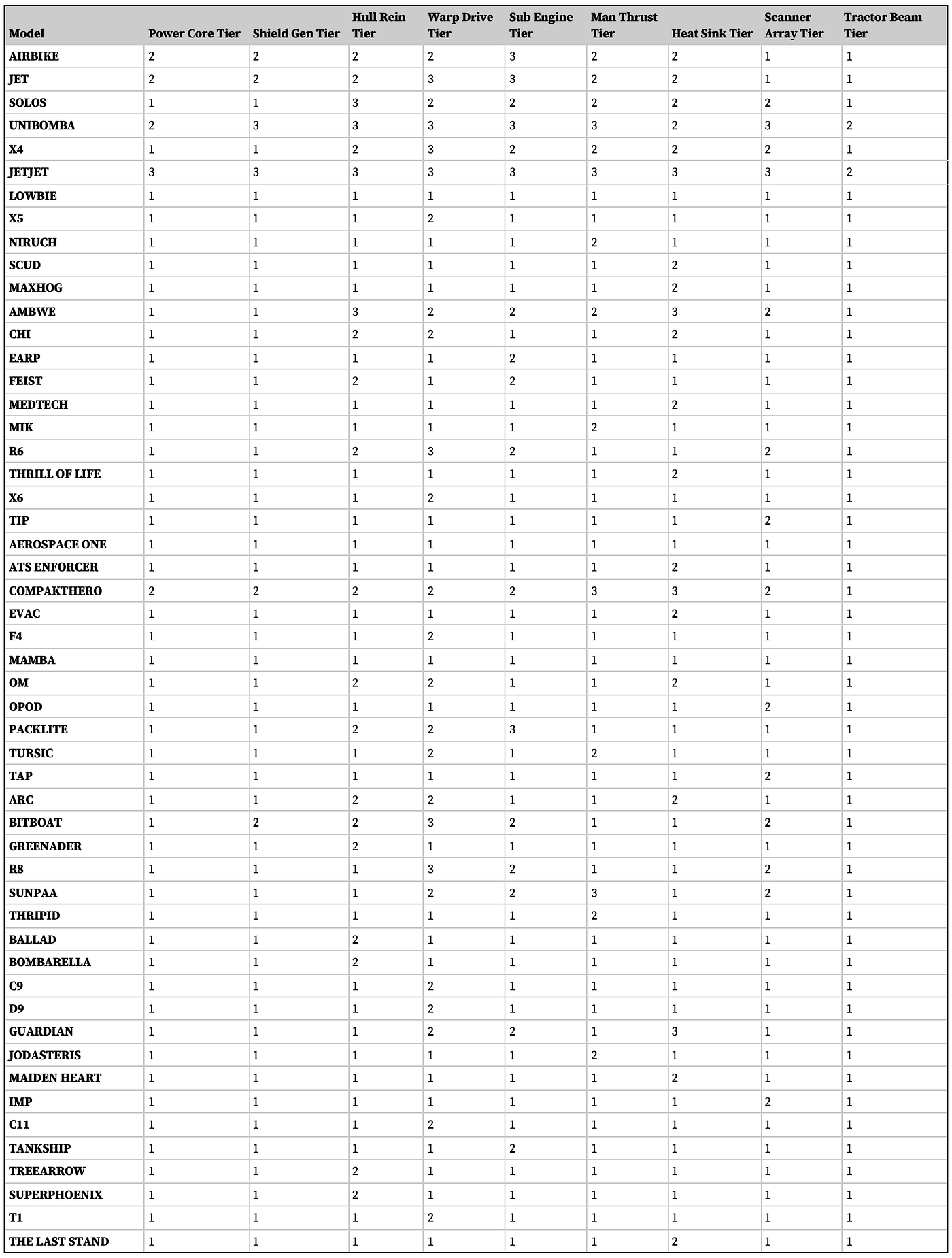 The table below lists the core component tiers that will be granted to each ship pending the snapshot. Core components range from Tier 0 to Tier 5.