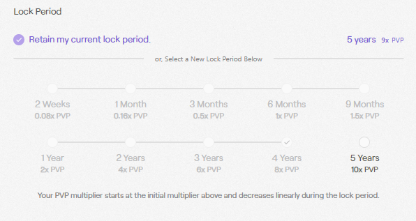 This process happens through the use of our governance token POLIS. When players lock their POLIS in the POLIS locker, ** they will get PVP (POLIS voting power), which is based on the quantity of POLIS locked, times a multiplayer that varies based on the different time periods, following the image below.