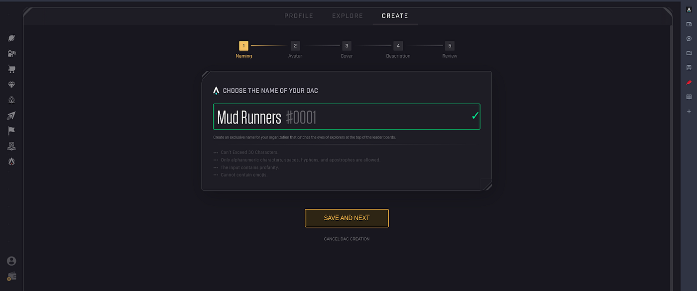 The first step in establishing an organization is to navigate to the DAC Platform creation page on our website. From there, our fearless new leaders will be guided on a quick five-step journey to establish a new organization in the Star Atlas metaverse.